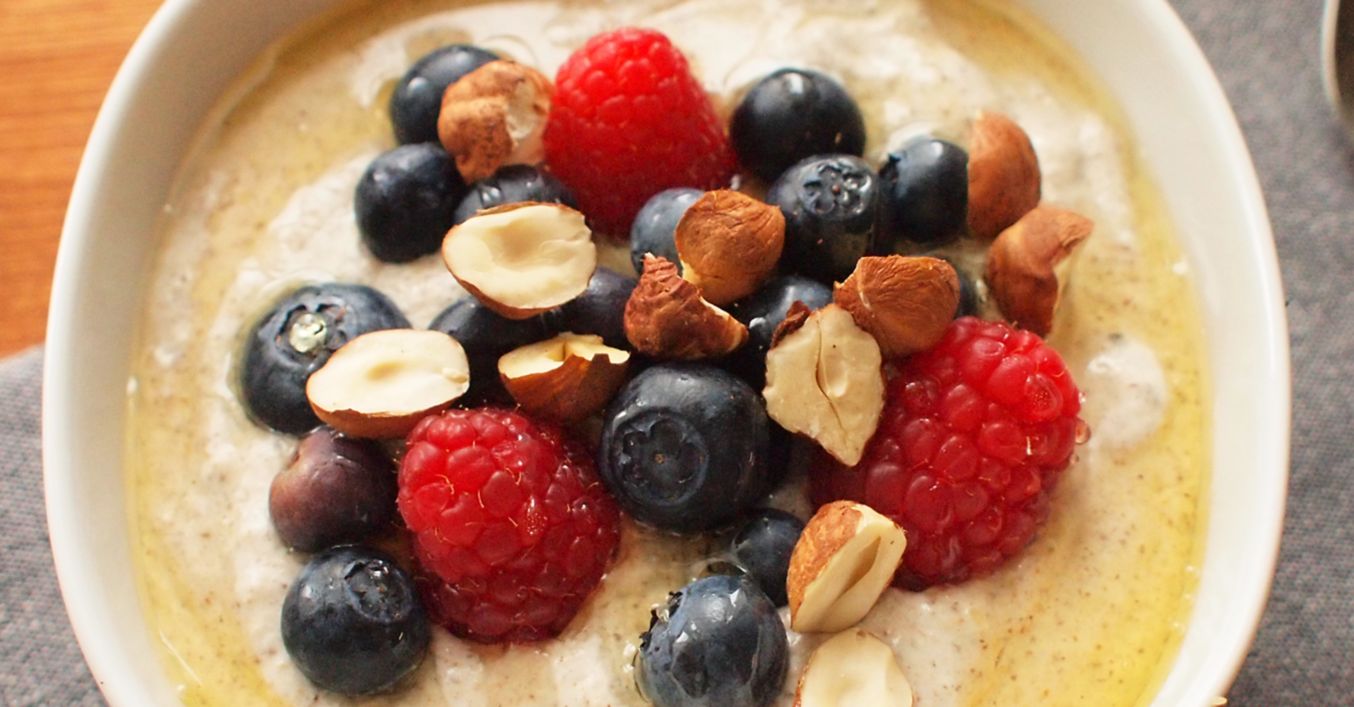 Do mixéru dáme banán, chia semínka a mandlové mléko. Rozmixujeme na kaši a necháme chvíli odstát. Servírujeme do misek společně s ovocem, sirupem a oříšky.