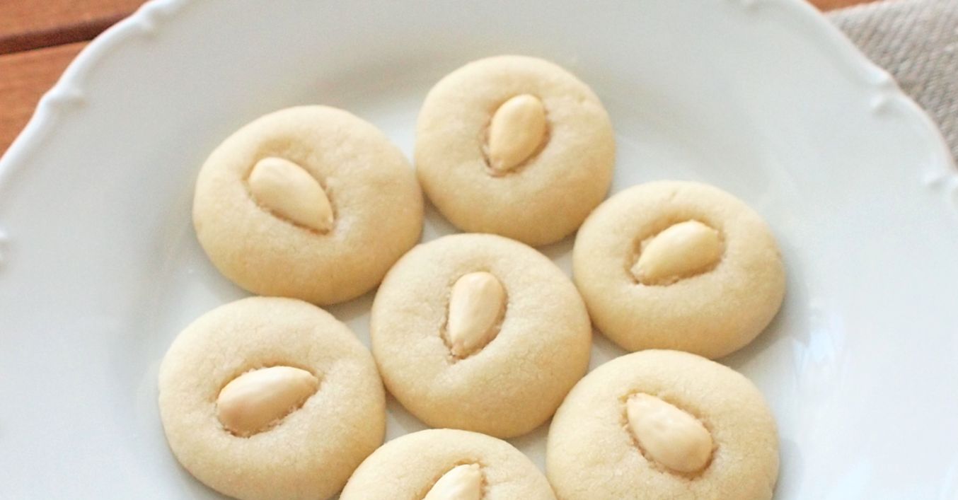 Těsto rozdělíme na 2 části a rozválíme na válečky (asi 2 cm v průměru), které nožem porcujeme na menší dílky. Každý pak vyválíme do kuličky, dlaní stlačíme a doprotřed zatlačíme loupanou mandli.