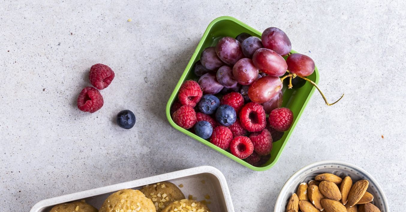 Z těsta tvarujte placičky, které posypejte nahrubo nakrájenými mandlemi. Dejte na plech vyložený pečícím papírem a pečte 10-12 minut. Po upečení sušenky nechte úplně vychladnout. Můžete doplnit ovocem (borůvky, maliny, hrozny).