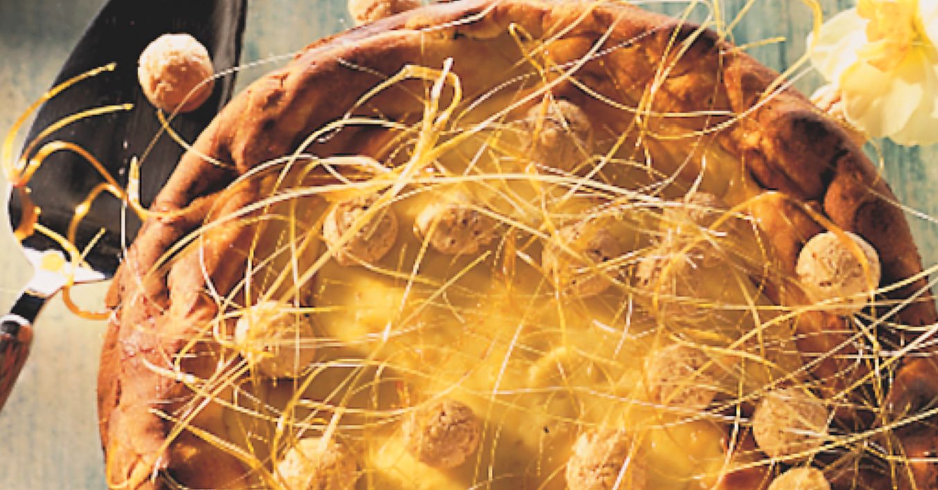 Tvaroh zbavíme přebytečné tekutiny okapáním v plátýnku. Vejce vyšleháme s cukrem do pěny. Smícháme s tvarohem, mascarpone, mandlemi, citrónovou šťávou a kůrou a mandlovým likérem. Důkladně rozmícháme a plníme do vychlazené formy se sušenkovým základem.