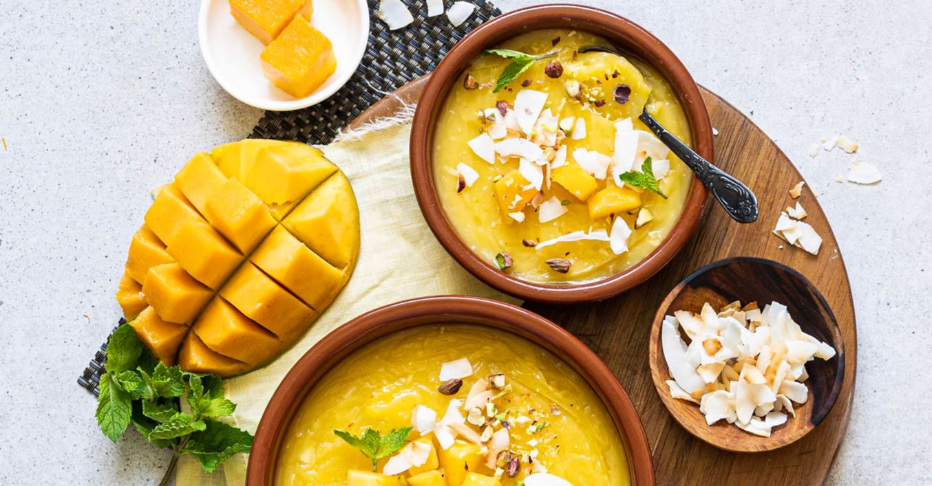 Puding vlijte do misek a nechte v lednici ztuhnout. Poté ozdobte zbytkem manga, orestovanými kokosovými plátky a mátou.