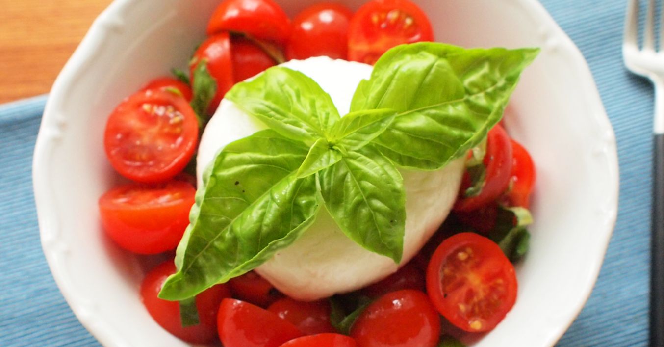 Odleželá rajčata servírujeme s mozzarellou a čerstvými lístky bazalky.