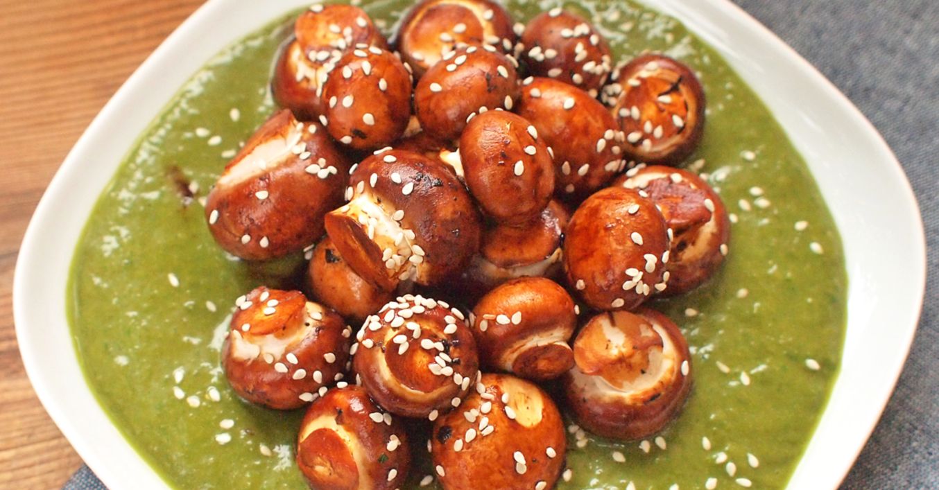 Žampiony očistíme, pokud jsou velké, tak i nakrájíme na poloviny nebo na čtvrtiny. Česnek i zázvor oloupeme a podrtíme. Do misky dáme žampiony se zázvorem a česnekem, zakápneme sójovou omáčkou a několikrát promícháme. Zakryjeme, dáme do lednice a necháme marinovat.