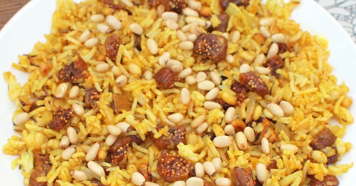 V pánvi rozehřejeme olej, přidáme cibuli s česnekem a necháme zesklovatět. Přidáme piniové oříšky, fíky a krátce orestujeme. Osolíme, vmícháme koření a přidáme rýži. Dobře promícháme a už jen krátce orestujeme a podáváme.
