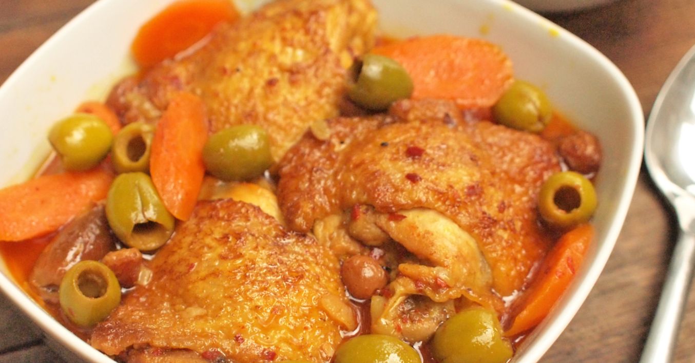 Přidáme vypeckované datle, rozinky a olivy a dusíme pod poklicí doměkka. Zabere nám to asi 45 minut. Hotové kuře podáváme s omáčkou a rýží.