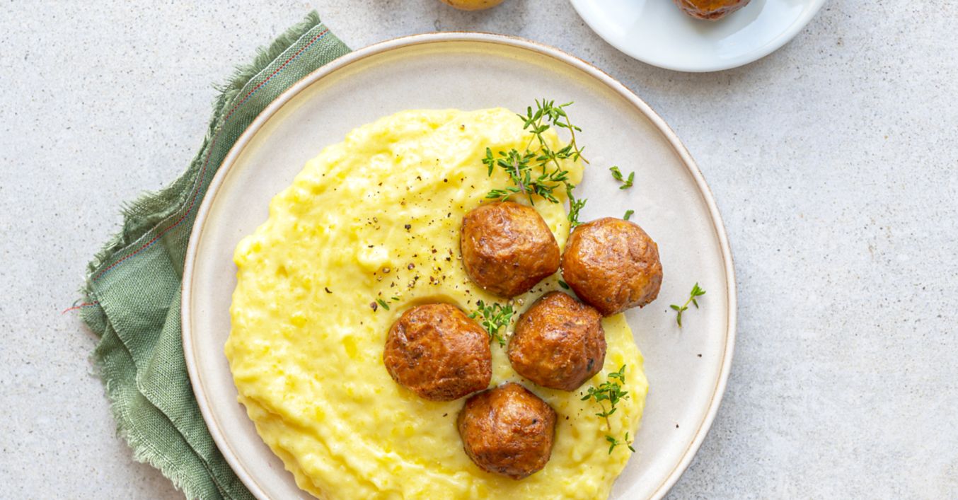 Brambory uvařte v osolené vodě doměkka. Poté vodu slijte a brambory rozmačkejte. Pak je vyšlehejte elektrickým šlehačem společně s teplým mlékem a máslem do jemna. Osolte a opepřete. Podávejte s kuličkami a čerstvým tymiánem.