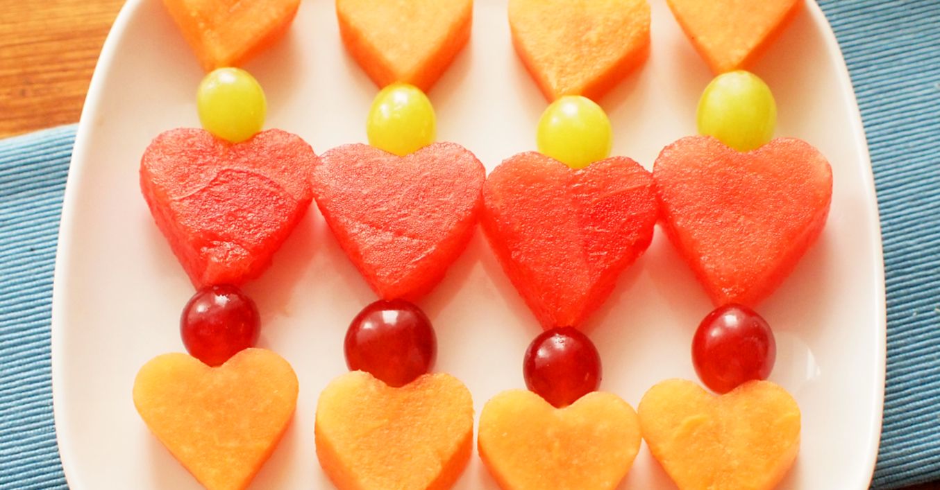 Na špejle střídavě napichujeme barevná melounová srdce a hroznové víno.