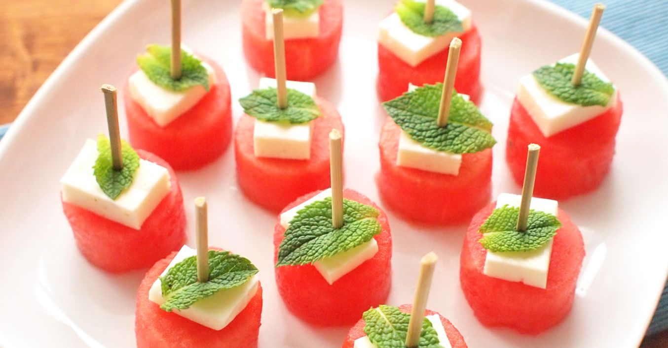 Z melounu, sýra a máty sestavíme jednohubky, které zajistíme párátkem.