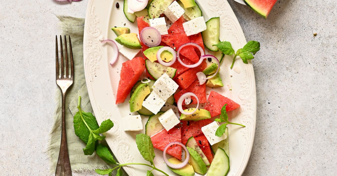 Melounový salát s avokádem a feta sýrem