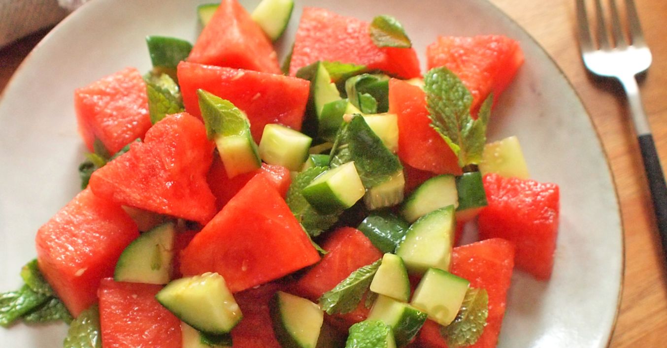 V míse smícháme okurku, meloun a mátu. Zastříkneme limetkovou šťávou a olivovým olejem. Dochutíme solí a pepřem. Promícháme a podáváme.