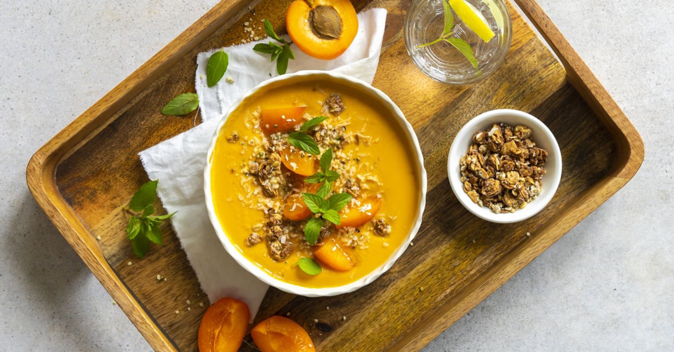 Meruňky rozmixujte s banánem, jogurtem, mlékem a vločkami. Vlijte do misky a ozdobte granolou, kokosem, meruňkami a mátou.