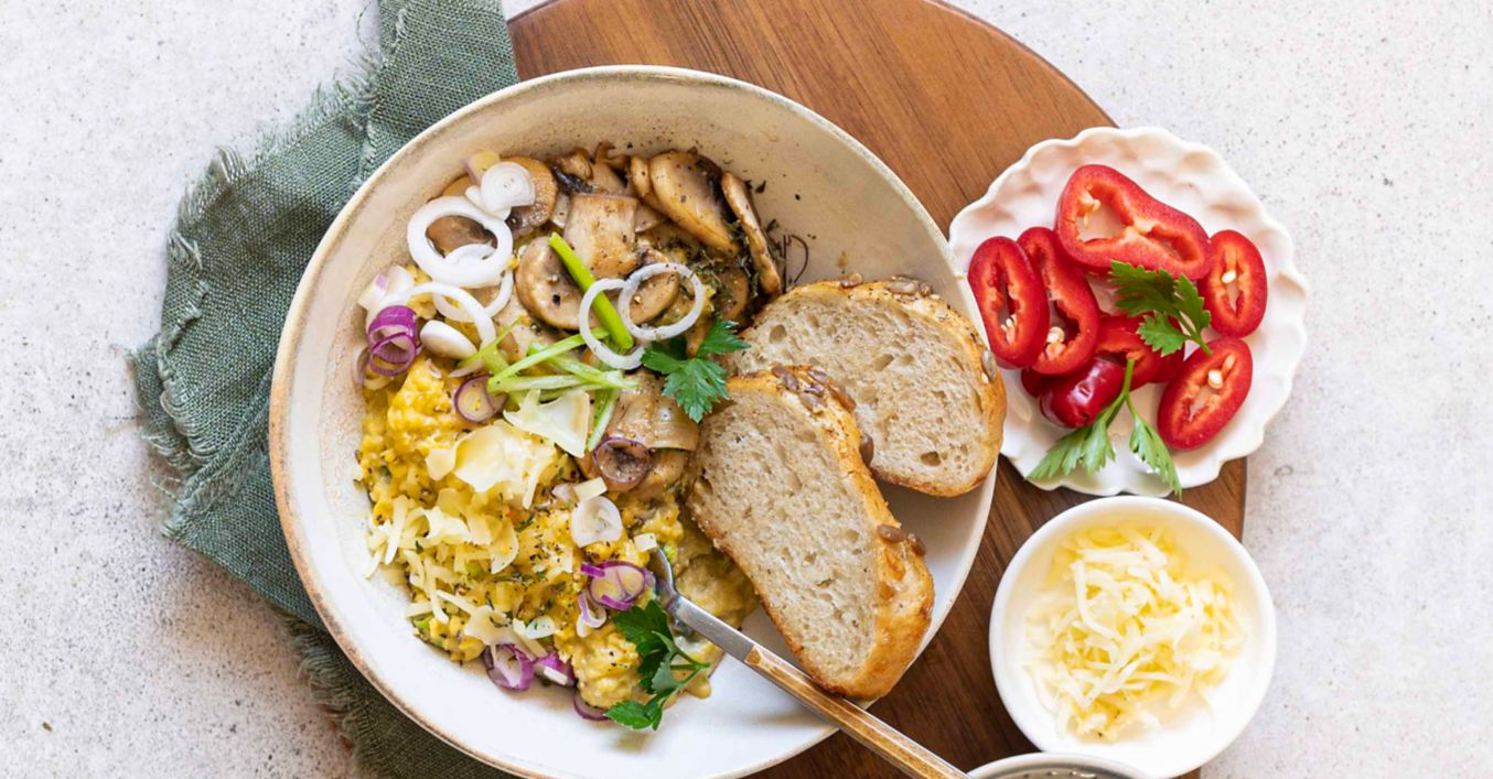 Míchaná vajíčka se sýrem, lahůdkovou cibulkou a žampiony