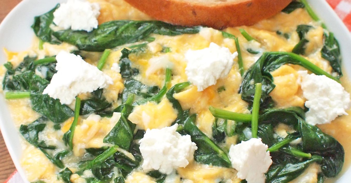 V pánvi rozehřejeme zbylé máslo, přidáme vejce a na mírném plameni je za stálého míchání povaříme, dokud nezískají krémovou konzistenci. Poté přidáme špenát, promícháme, přidáme kozí sýr a ihned podáváme.