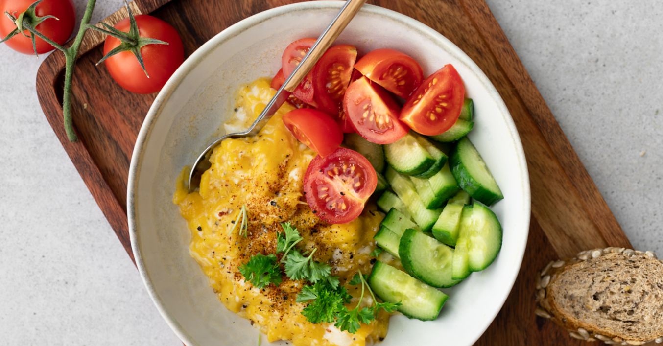 V pánvi rozpusťte na mírném stupni máslo. Pak vlijte vaječnou směs. Promíchávejte vařečkou od kraje do středu pánve, dokud vejce nejsou hotová. Přesuňte do misky nebo na talíř a posypte petrželkou. Podávejte s rajčaty, okurkou a pečivem.