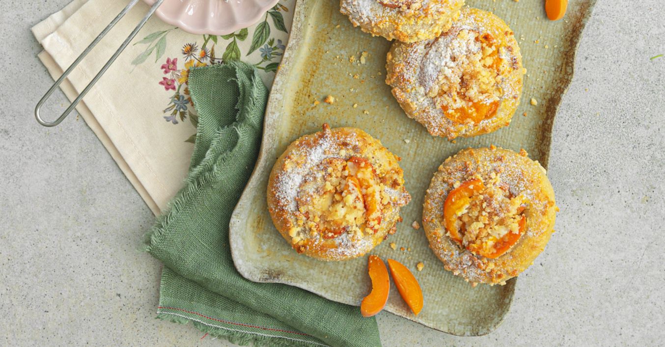 Vykynuté těsto rozdělte na 12 menších dílů, které zpracujte do kuliček. Z těch poté vytvořte placičky. Placičky dejte na plech vyložený pečícím papírem. Do středu každé dejte nakrájené meruňky. Poté koláčky zakryjte utěrkou a nechte kynout dalších 30 minut.