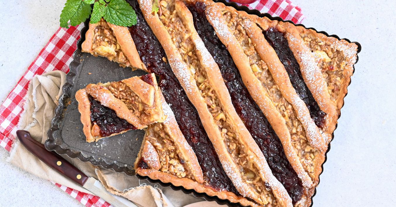 Na povrch těsta střídavě rozložte nastrouhaná jablka a marmeládu.