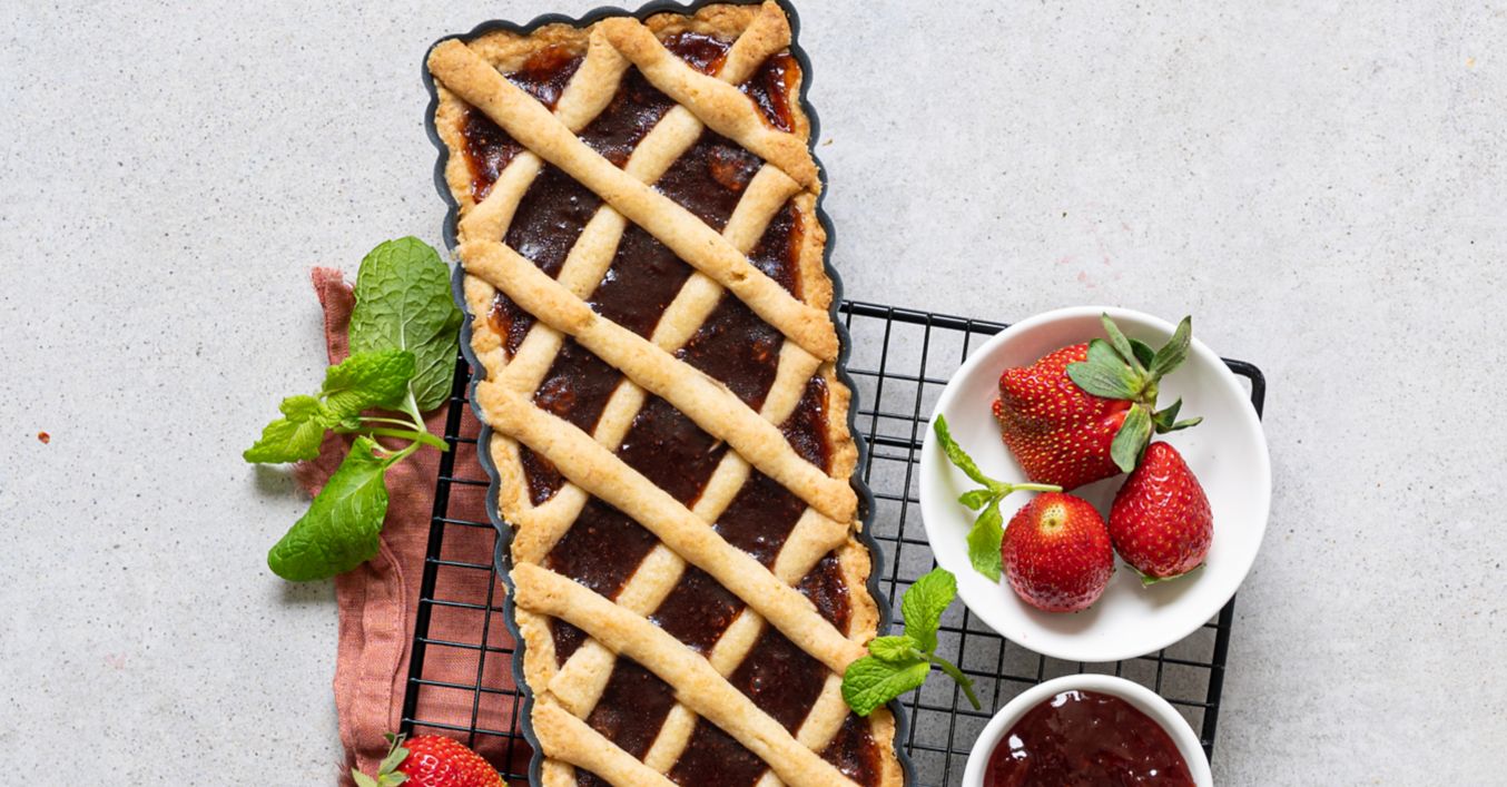 Ze zbytků těsta vytvořte tenké válečky. Ty dejte na povrch koláče tak, aby vytvořily tvar mřížky.
