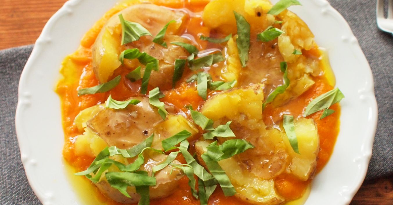 Mrkev oloupeme, nakrájíme na dílky a dáme do hrnce spolu s vývarem. Osolíme a uvaříme doměkka (asi 20 minut, podle potřeby podlijeme vývarem navíc). Ke konci vmícháme máslo a rozmixujeme na hladké pyré. Podáváme společně s rozmačkanými vařenými bramborami a nasekanými bylinkami.