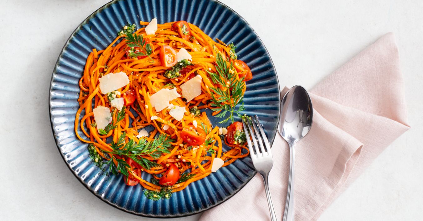 Jako poslední krok rozmixujeme cherry rajčátka, smícháme s mrkvovými špagety, přidáme zbylé kousky mrkve, rajčátek a natě. Nakonec špagety zalijeme pestem a posypeme parmazánem s mandlemi.