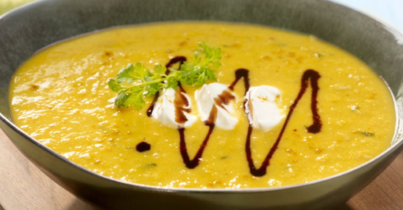 Uvařenou polévku odstavíme, rozmixujeme tyčovým mixérem a dochutíme solí, pepřem, kari kořením a chilli.