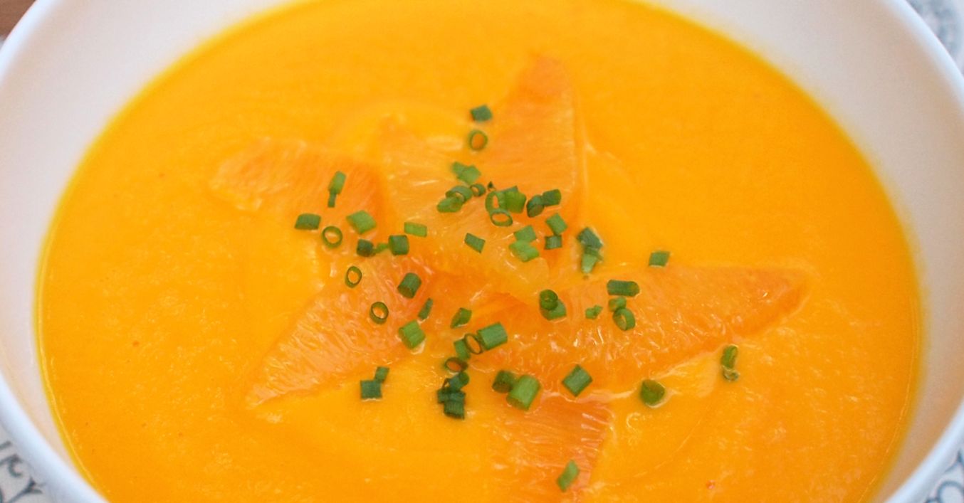 Uvařenou polévku odstavíme a rozmixujeme tyčovým mixérem. Vmícháme smetanu a necháme prohřát. Podle potřeby dochutíme solí, pepřem a trochou citronové šťávy. Porcujeme do talířů a zdobíme dílky pomeranče.
