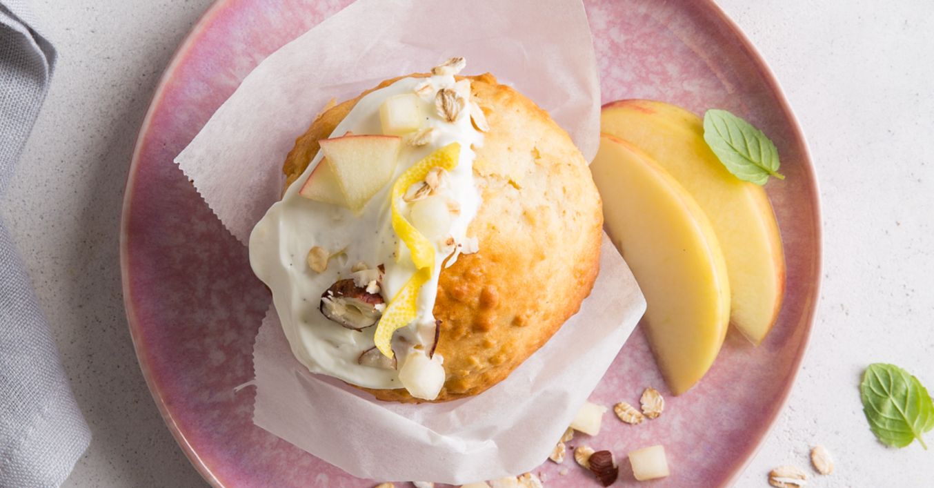 Vychladlé muffiny podávejte s tvarohovou polevou a ozdobené plátky jablek a oříšky, pokud chcete.