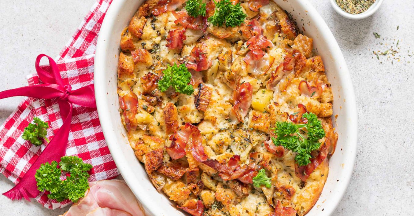 Orestovanou cibuli s česnekem přidejte k pečivu spolu s bílky, sušenou majoránkou a slaninou. Osolte, opepřete a promíchejte.