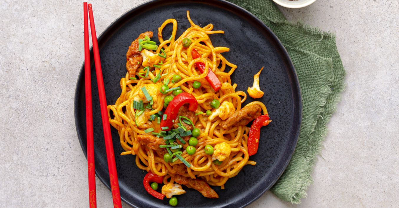 K masu a zelenině přidejte nudle a sójovou omáčku. Promíchejte.