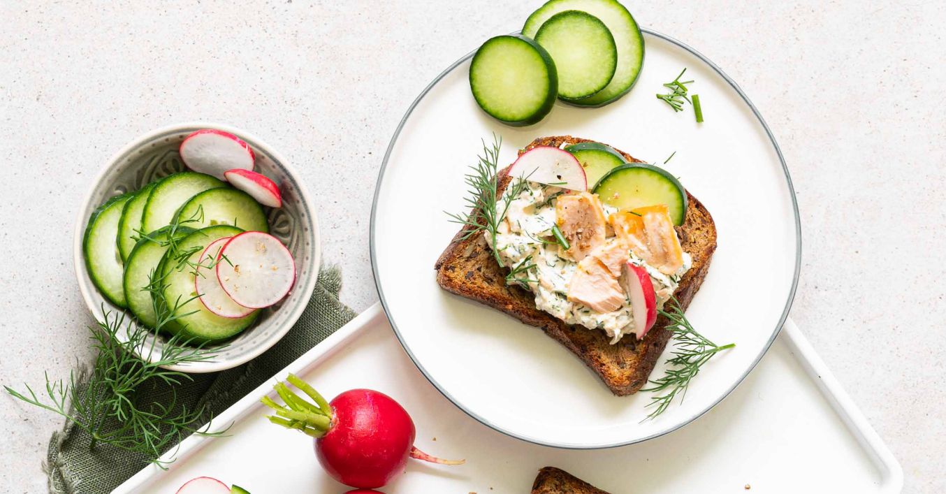 Pomazánkou namažte pečivo. Na ni rozprostřete kousky orestovaného lososa.