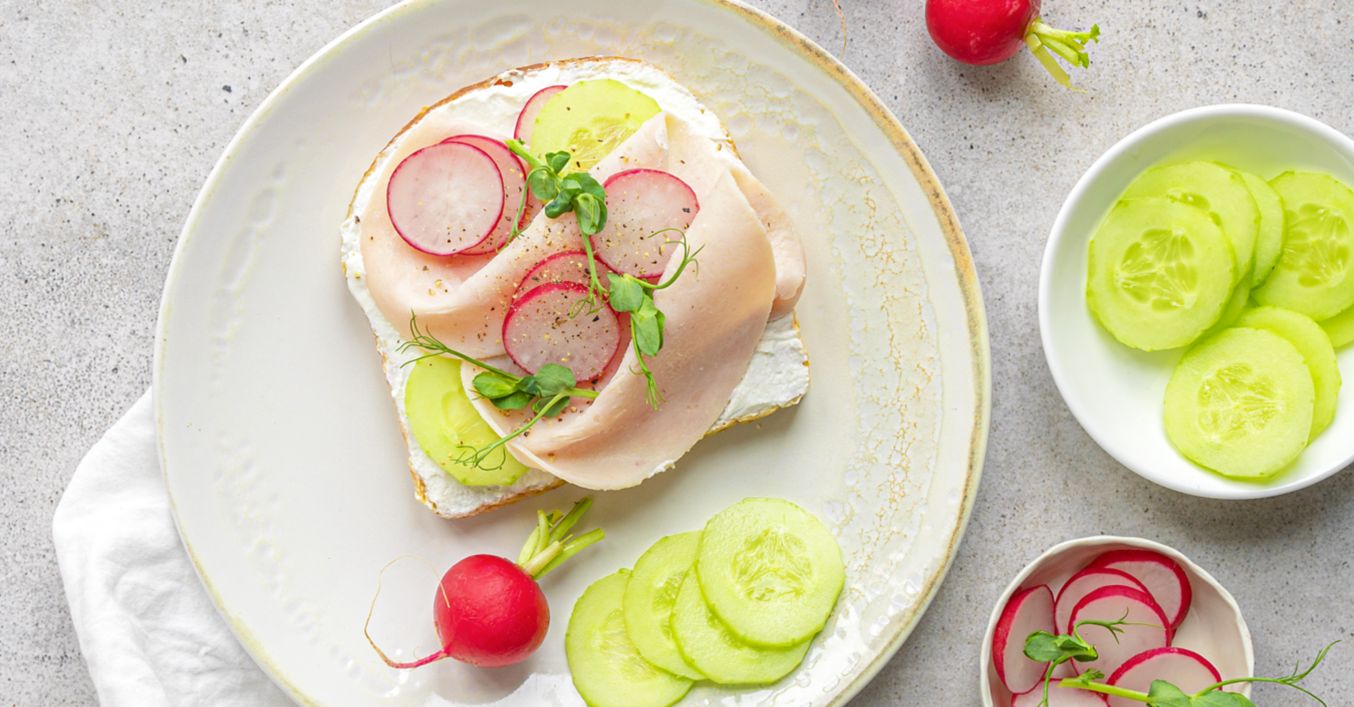 Plátek chleba namažte krémovým sýrem. Navrch položte 2 plátky šunky, okurky a ředkvičky.