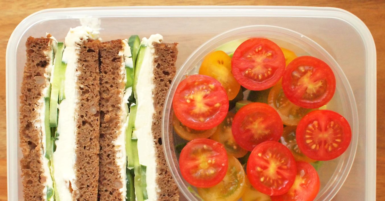 Chléb namažeme lučinou a obložíme okurkou. Překrojíme napůl a uložíme do krabičky. Avokádo a rajčata uložíme stranou do misky.