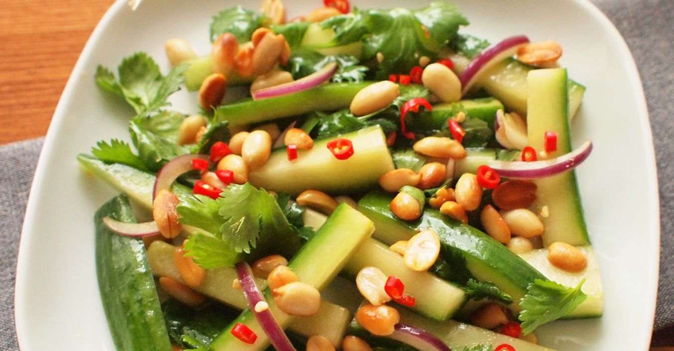 Okurky očistíme, oloupeme a nakrájíme na dílky. Koriandr očistíme, necháme okapat a nasekáme i se stonky nahrubo. Cibuli oloupeme a nakrájíme na tenké plátky. Arašídy opražíme nasucho na pánvi a nasekáme nahrubo. Chilli papričku zbavíme stopky, semínek a nakrájíme na nudličky.