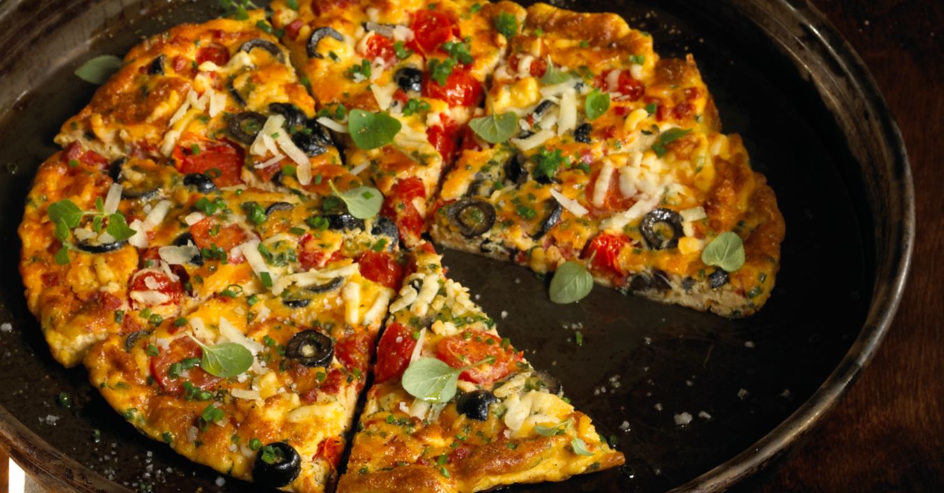 V míse rozšleháme vejce se šlehačkou a zakysanou smetanou. Osolíme, opepříme a smícháme s olivami, klobáskou, rajčaty, parmazánem a pažitkou.