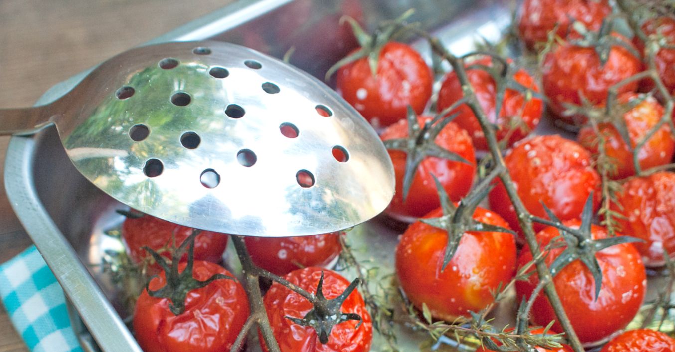 Troubu si rozehřejeme na 200 °C. Rajčata umyjeme a nakrájíme na poloviny. Menší rajčata můžeme nechat klidně celá.