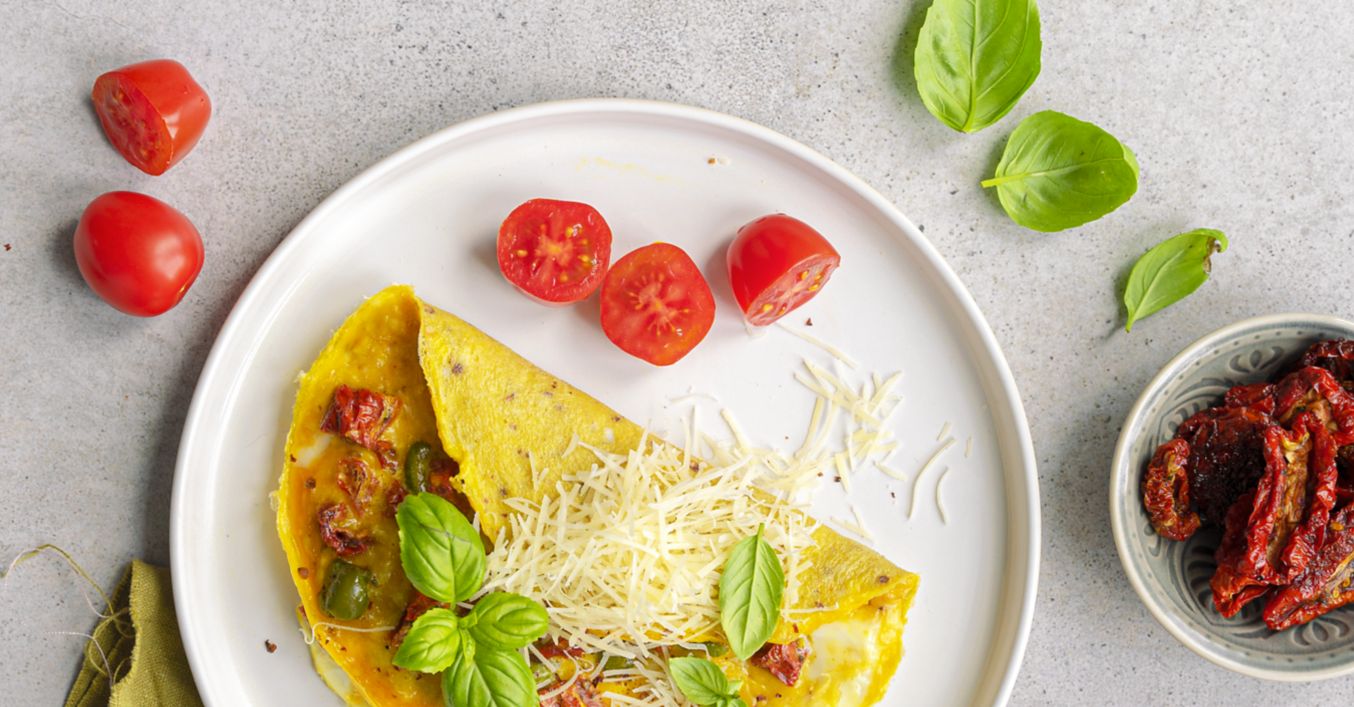 Omeleta se sušenými rajčaty, parmazánem a olivami