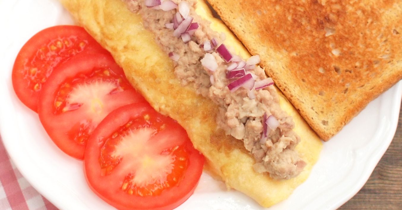 V pánvi rozehřejeme olej, přidáme vejce a rozlijeme je po celé ploše pánve. Omeletu necháme propéct asi do poloviny. Přidáme nadrceného tuňáka, cibuli a petržel.