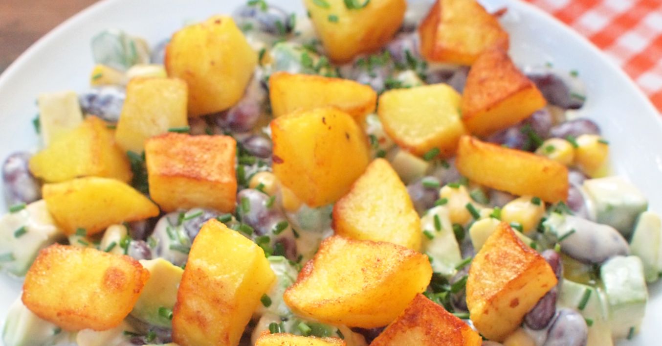Brambory nakrájíme na kostky a opečeme na másle dozlatova. Podáváme pak společně s připraveným fazolovým salátem.
