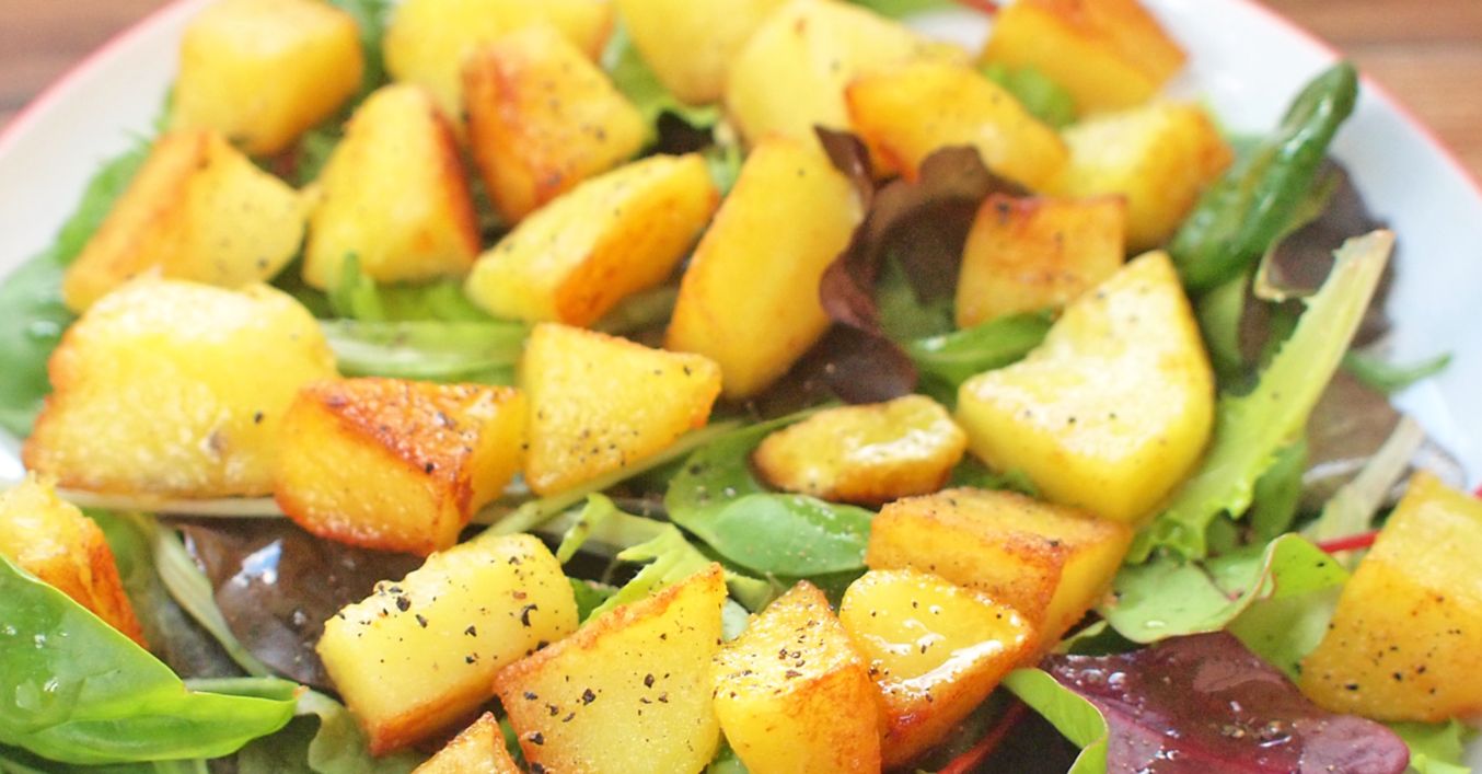 Brambory nakrájíme na kostky a opečeme na másle dozlatova. Opečené brambory osolíme a opepříme. Podáváme pak společně s připraveným salátem a se zálivkou.