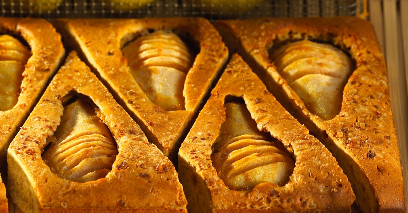 Na pečení použijeme obdélníkovou formu s vyšším kolmým okrajem, kterou vymažeme tukem. Hrušky oloupeme, podélně rozpůlíme a zbavíme jádřince. V rendlíku pak svaříme dezertní víno se zbylým cukrem a hrušky v něm krátce podusíme. Nejdéle 5 minut a opatrně, abychom je nepolámali.
