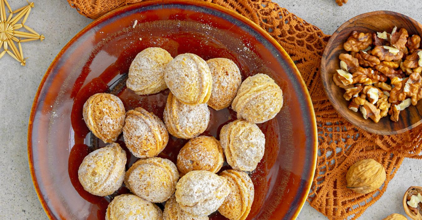 Malé kousky těsta vtlačte do formiček na ořechy tak, aby vznikl důlek na krém. Pečte 8-10 minut v troubě rozpálené na 160 °C.