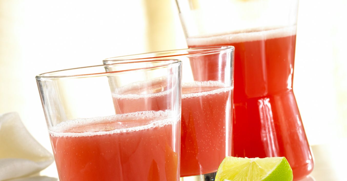 Jablečnou a třešňovou šťávu smícháme v karafě s pomerančovým džusem a přidáme šťávu z poloviny limetky.