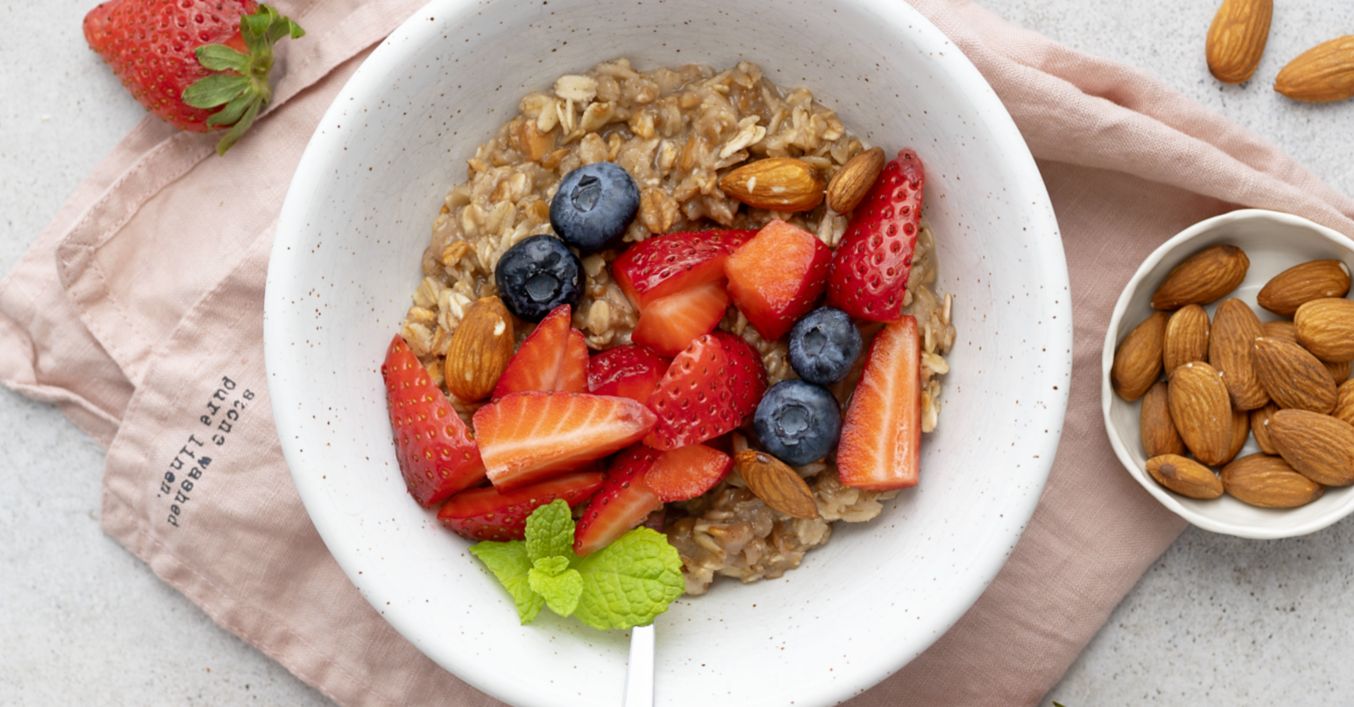 Ovesné vločky, mléko a skořici dejte do hrnce. Vařte 5 minut do změknutí vloček. Pak vmíchejte lžíci másla. Dejte do misky a ozdobte jahodami, borůvkami, kokosem a mandlemi.