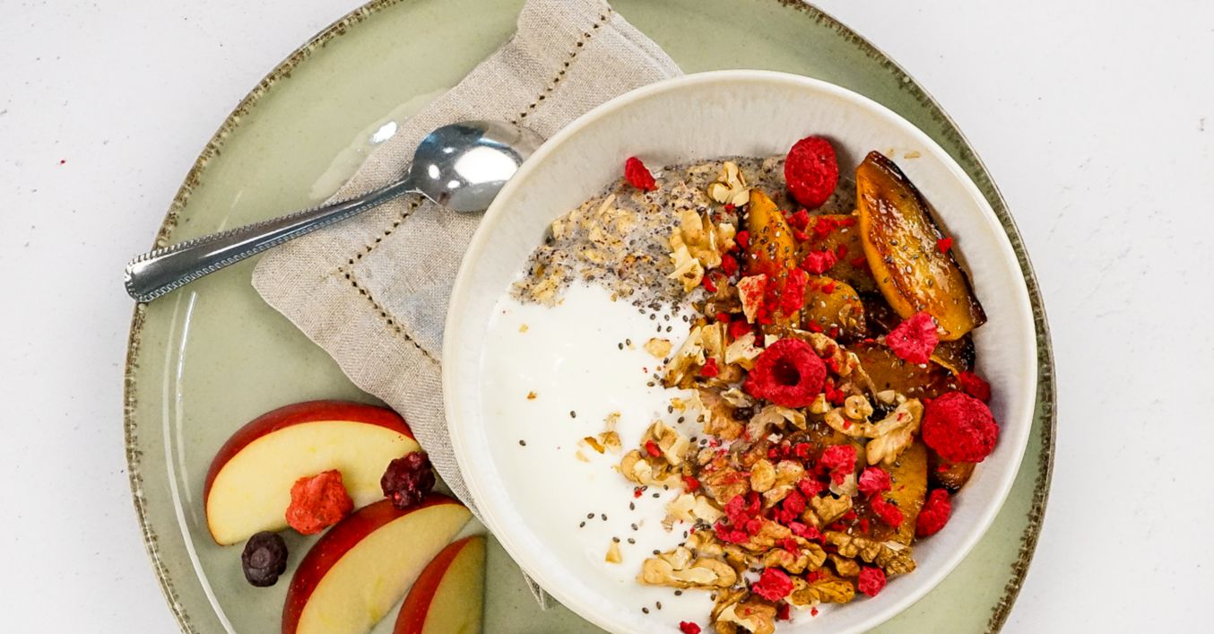 Ovesná kaše s jogurtem, pečenými jablky a ořechy