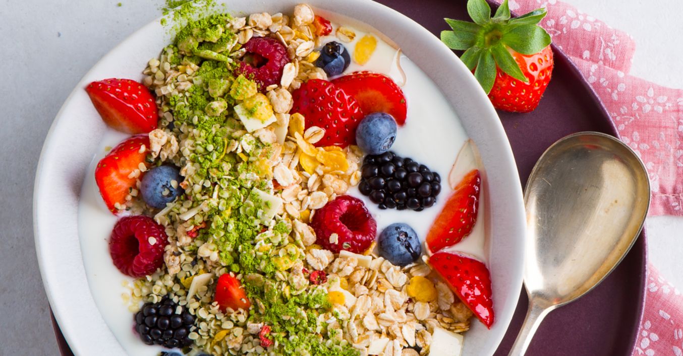 Vmíchejte müsli, konopná semínka, lněný olej a matcha prášek.