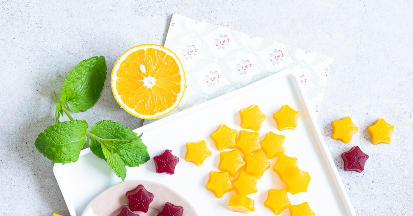 Připravte pomerančové bonbóny. Pomerančovou šťávu vlijte do hrnce, přidejte zbytek cukru, želatiny a citrónovou šťávu. Opět zahřejte. Jakmile se cukr a želatina rozpustí, vlijte směs do formy na bonbóny. Dejte do lednice ztuhnout.
