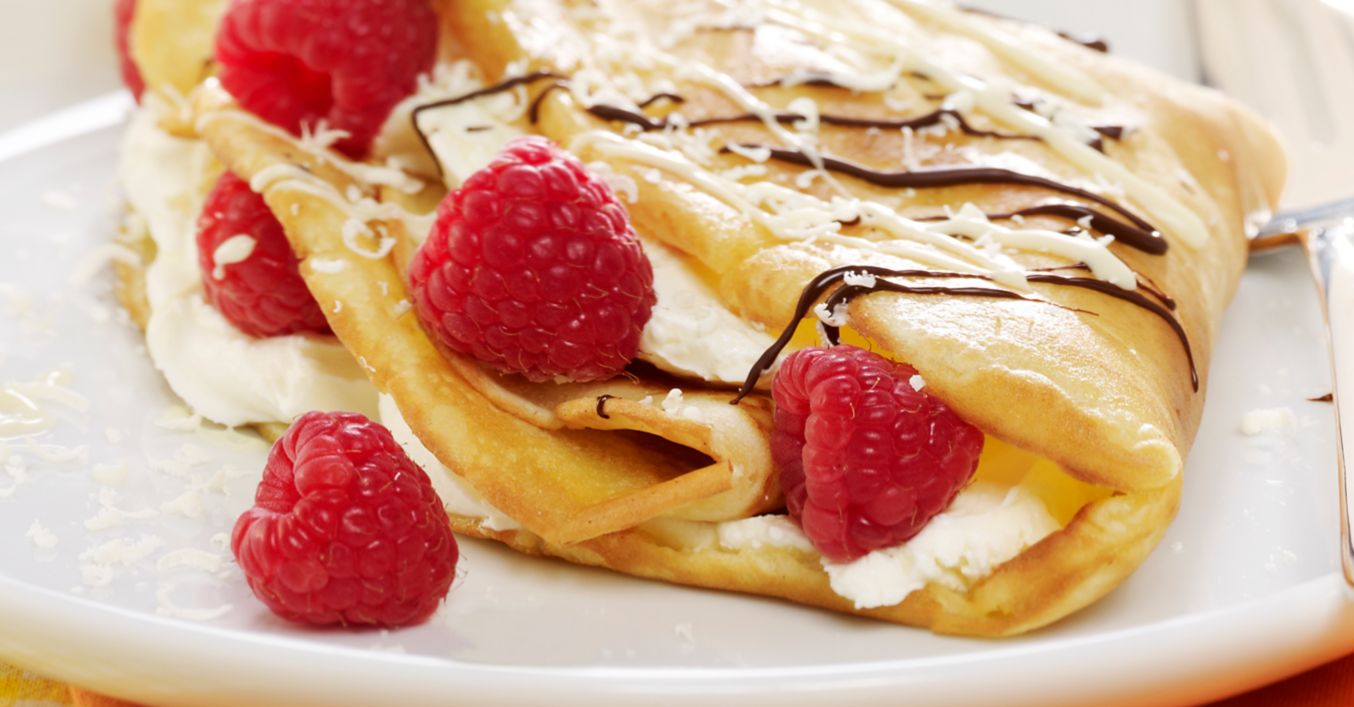 Palačinky plníme směsí mascarpone s malinami. Zdobíme tenkými proužky rozpuštěné bílé čokoláda a hned podáváme.