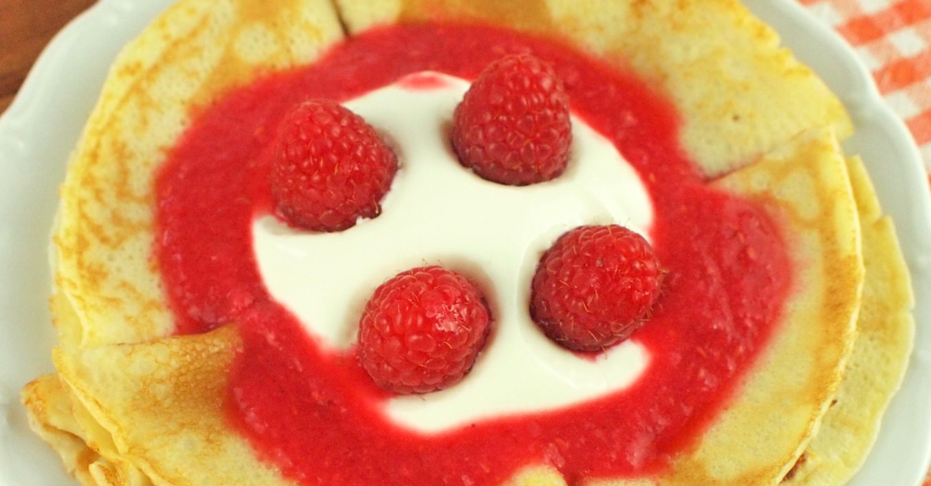 Hotové palačinky přiklopíme talířem, aby nevychladly. Zdobíme zakysanou smetanou a malinovou omáčkou.
