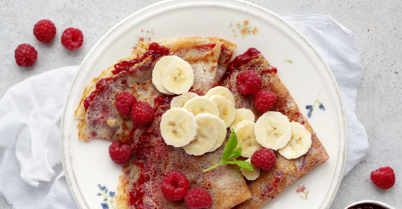 Každou palačinku potřete lžící malinové marmelády. Ozdobte čerstvými malinami, banánem a čerstvou mátou.