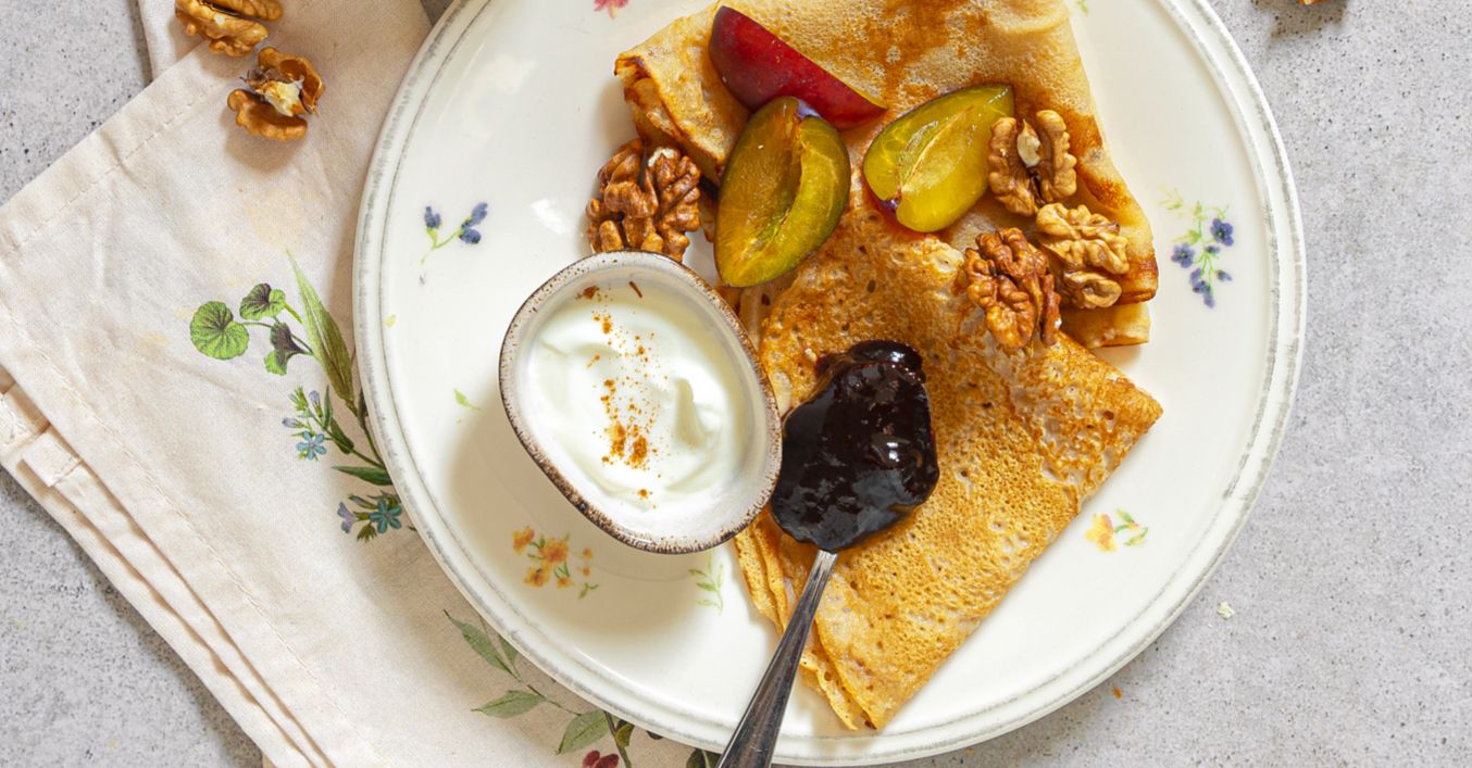 Palačinky podávejte s ochuceným tvarohem, povidly, švestkami a vlašskými ořechy.