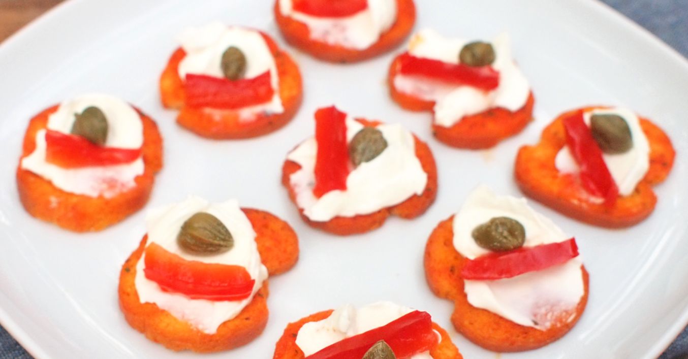 Připravené krekry poté namažeme pomazánkovým máslem a ozdobíme kápií a kaparami.